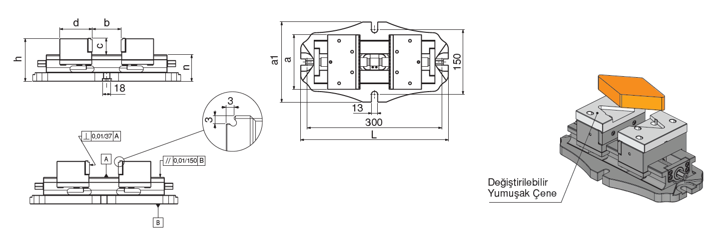 • Yumuşak çeneler, herhangi bir sökme işlemi yapılmadan mengeneye monte edilir. İş parçası profiline uygun şekilde işlenerek hassas ve güvenli bir sıkma sağlar.